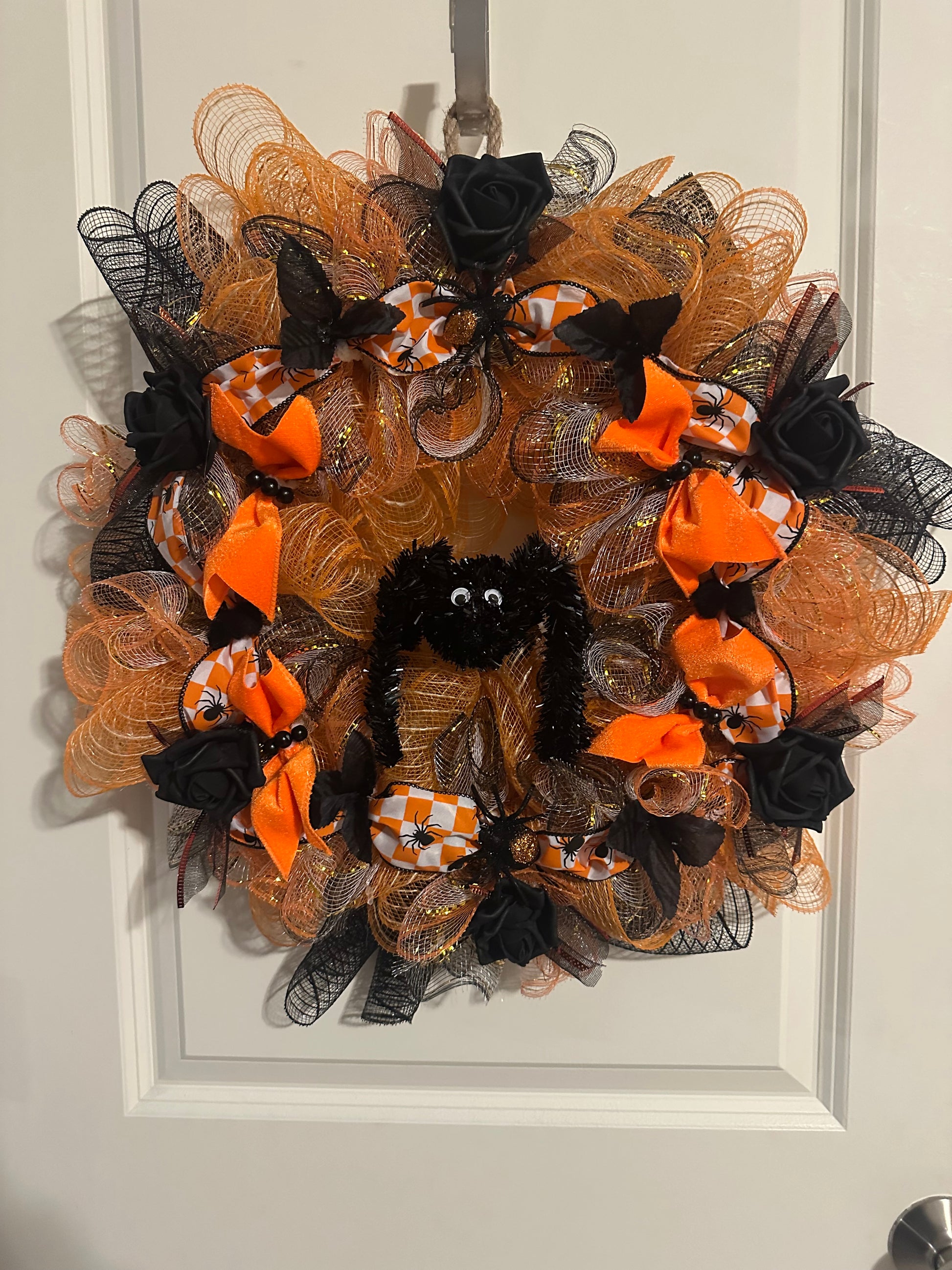 Add a playful touch of spooky charm to your door this Halloween! This festive deco mesh wreath blends glowing orange and shimmering black layers, accented with satin bows, creepy-crawly spiders, and elegant black roses. A fuzzy spider centerpiece gives it that perfect mix of eerie and adorable - ideal for welcoming trick-or-treaters with Halloween spirit and a hint of sass!