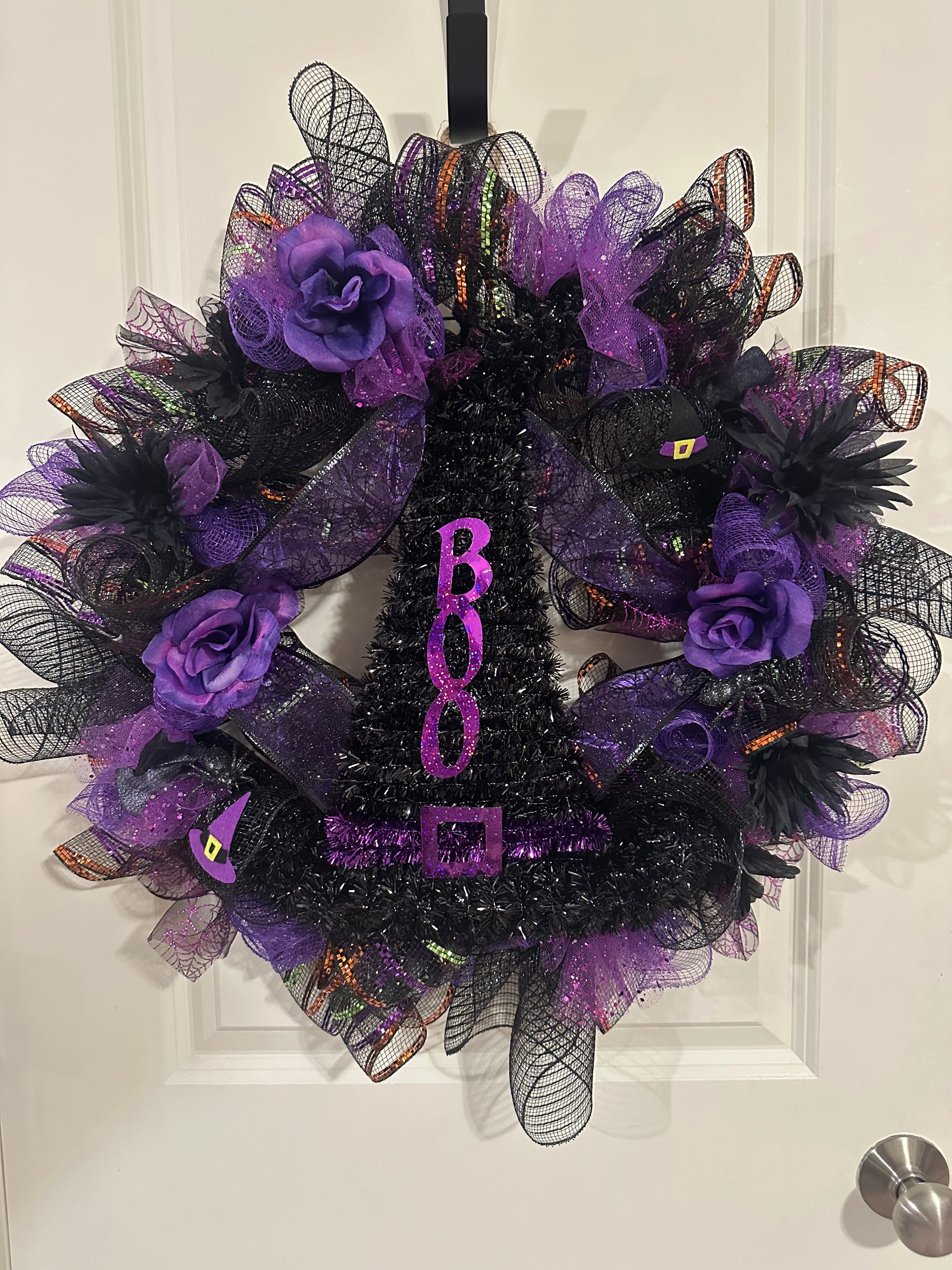 This handmade Halloween wreath features shimmering purple mesh, black florals, and a glittery witch hat that says BOO! - perfect for adding a little spooky sparkle to your door this season.